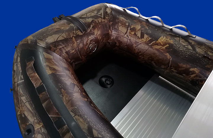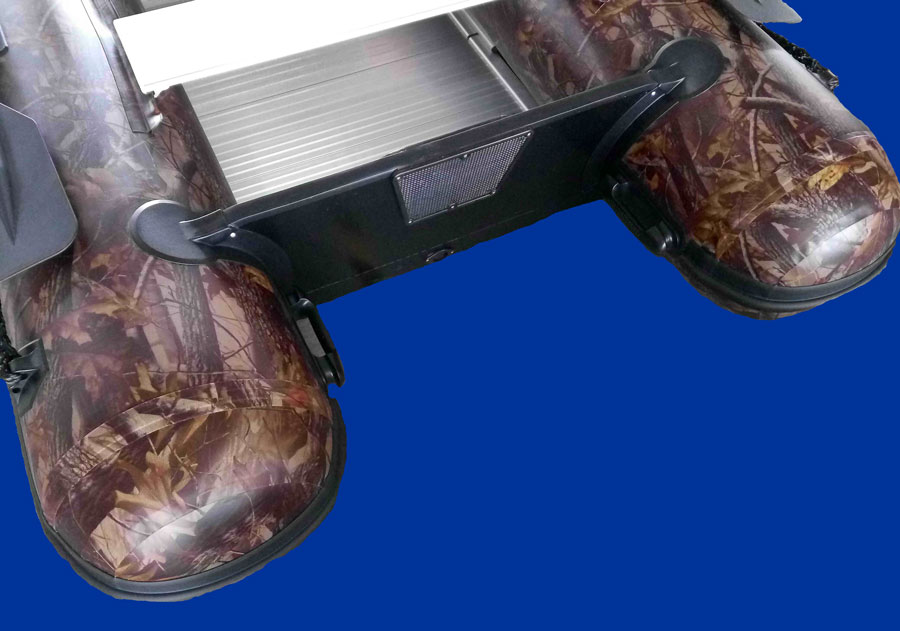 La marque maëlyss B. propose des bateaux pneumatiques pour les pêcheurs en colori new camou, Un auvent de proue et PVC 1.0mm.